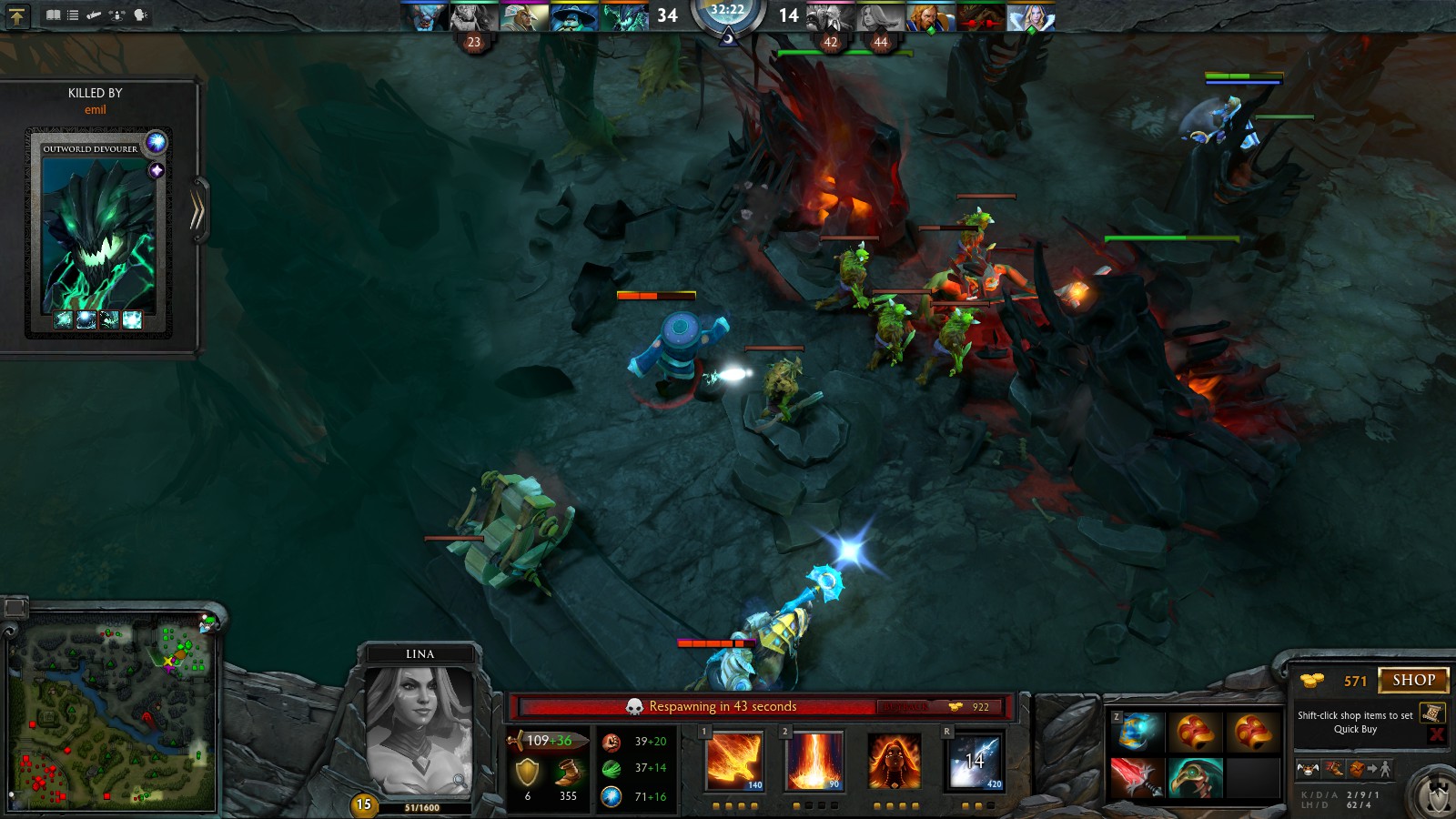 But I pretty quickly gained a basic understanding of the game. I settled on a hero I liked, a fire mage named Lina, and developed a strategy of defense in the early game leading into cautious aggression at high levels.