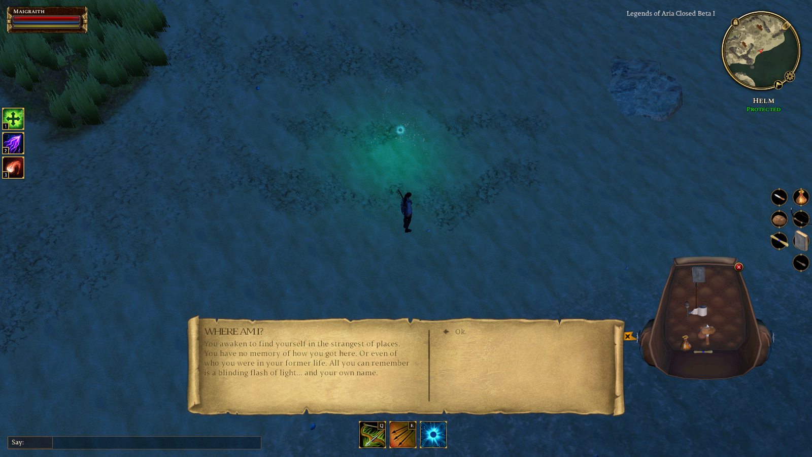 Starting out in Legends of AriaUpon logging in, my character woke up on a beach with no memory [wince] and was greeted by a sparkly globe that serves as the game’s only source of guidance. This is a true sandbox, with no quests at all so far as I can tell, so you need to figure out goals for yourself.
